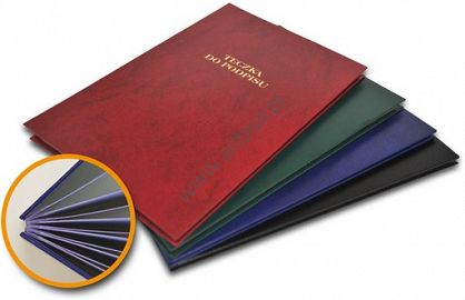 Teczka do podpisu z okienkiem Warta 20 kartTeczka do podpisu z okienkiem Warta 20 kart. Okładka twarda oklejana, grzbiet harmonijkowy. Łączenie okładki z blokiem wzmocnione nitami. Na...