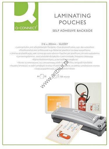 Folia do laminowania Q-Connect A4 samoprzylepna 2x125mikr 25 kompletów. Folia do laminowania dokumentów o grubości 2x125µm transparentna samoprzylepna, format A4. Jednostka sprzedaży: 1 opakowanie (25kpl.)